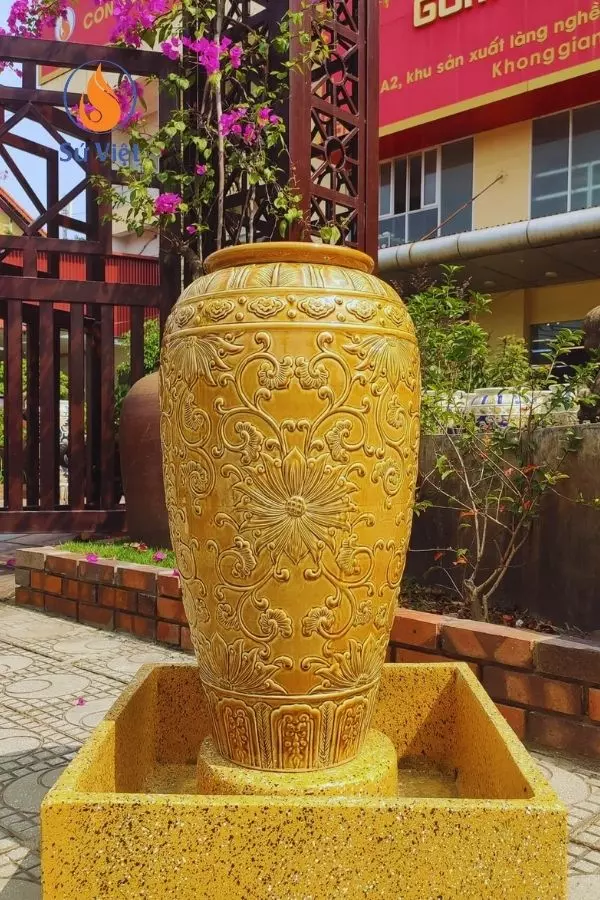 Tạo điểm nhấn với họa tiết hoa văn khắc nổi tinh tế, lu nước khắc hoa mang giá trị nghệ thuật cao, thể hiện sự sáng tạo và vẻ đẹp tinh xảo qua từng chi tiết.